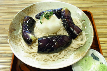 茄子を素揚げし、さっぱり大根おろしでいただく「揚げなすおろし。素揚げして甘みが増した「茄子」と「大根おろし」のハーモニーが抜群!さっぱり味のそばです(うどんもお好みで選べます)。